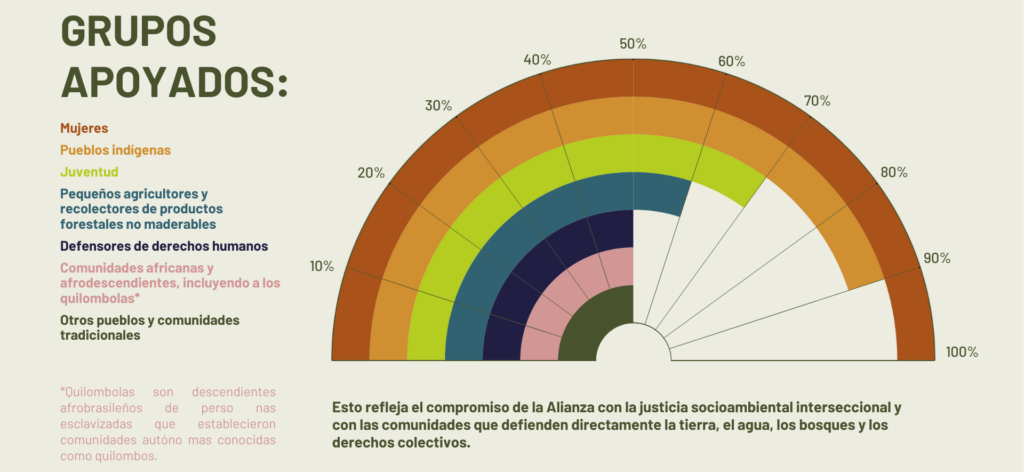 El informe muestra una capacidad de distribución de recursos en rápido crecimiento. Solo en 2024, los fondos de la Alianza otorgaron 14 millones de dólares en subvenciones — casi el doble de lo reportado en 2022 — y el 100% de estos recursos llegó a actores de primera línea, tales como grupos comunitarios, organizaciones indígenas, instancias de gobernanza local, emprendimientos comunitarios y, en algunos casos, familias e individuos.